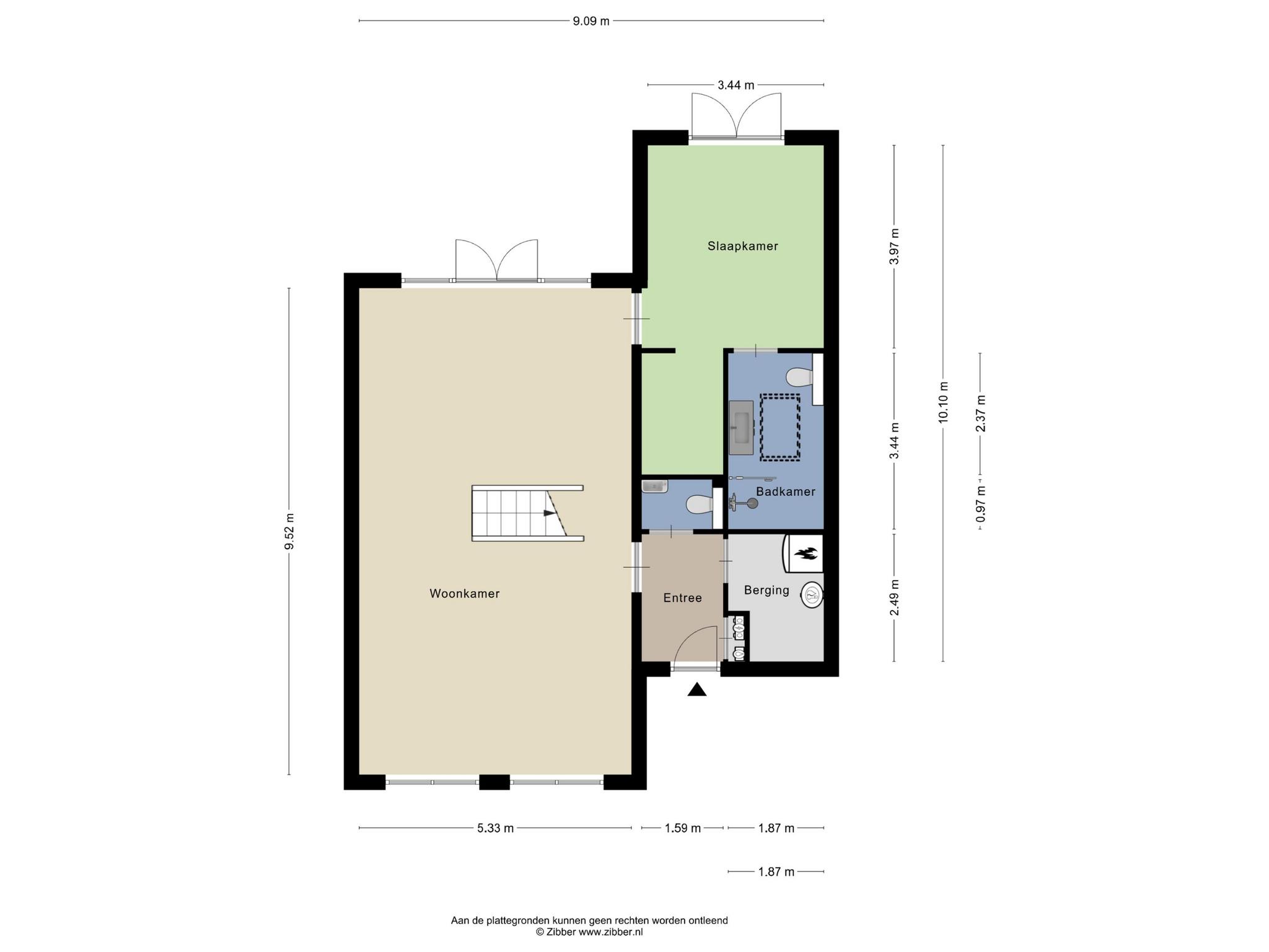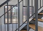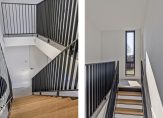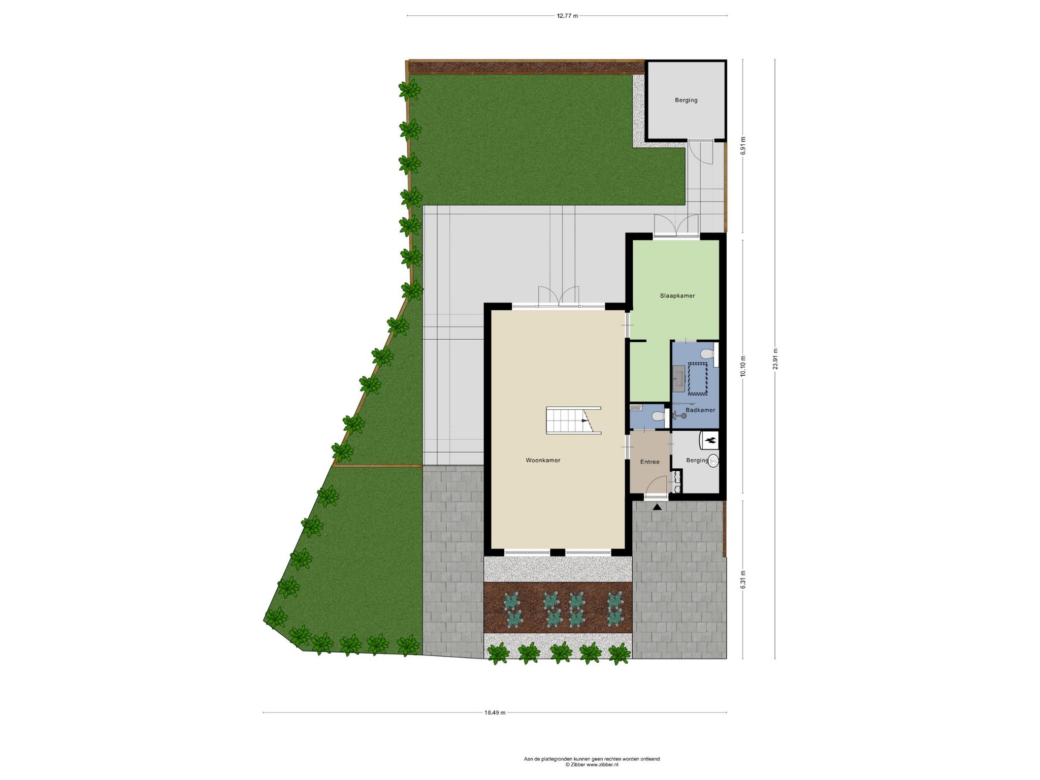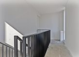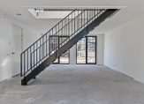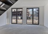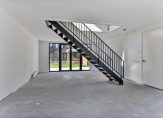 Hal met meterkast en luxe toiletruimte voorzien van wandcloset en fontein. Via de hal is ook toegang tot de inpandige berging en tevens technische ruimte. Hier staat de technische installatie en zijn aansluitingen voor het witgoed. De ruime woonkamer met open keuken is totaal circa 50 m² groot. In het midden van de leefruimte is een fraaie stalen trappartij met hardhouten treden naar de verdieping. Dit is een echte eyecatcher in de woning. Er zijn verder grote raampartijen met openslaande tuindeuren aan de achterzijde. De aansluitingen voor de keuken zitten aan de achterzijde van de woning.