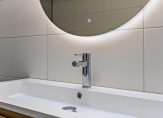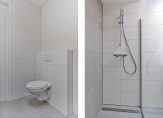 Vanuit het leefgedeelte is direct toegang tot een ruime slaapkamer met inloop-/kleedruimte van totaal circa 17.5 m². Door de aanwezigheid van een kleedruimte hoeft er in het slaapgedeelte ook geen kast geplaatst te worden. De slaapkamer heeft ook openslaande deuren naar de tuin. Bij de slaapkamer is direct ook de badkamer aanwezig, welke luxe is uitgevoerd met een grote inloopdouche, wandcloset en wastafel met meubel. Op de 1e verdieping is een royale overloop met toegang tot twee slaapkamers van beiden circa 10 m².