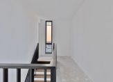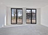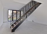 Hal met meterkast en luxe toiletruimte voorzien van wandcloset en fontein. Via de hal is ook toegang tot de inpandige berging en tevens technische ruimte. Hier staat de technische installatie en zijn aansluitingen voor het witgoed. De ruime woonkamer met open keuken is totaal circa 50 m² groot. In het midden van de leefruimte is een fraaie stalen trappartij met hardhouten treden naar de verdieping. Dit is een echte eyecatcher in de woning. Er zijn verder grote raampartijen met openslaande tuindeuren aan de achterzijde. De aansluitingen voor de keuken zitten aan de achterzijde van de woning.
