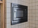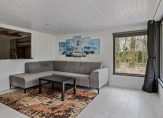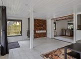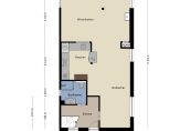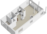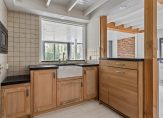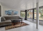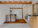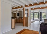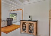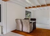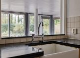 De voordeur zit aan de voorzijde van de woning. Daar is de hal met trapopgang naar de verdieping en de badkamer met wastafel, douchecabine en toilet. Bij binnenkomst in het leefgedeelte van de woning valt gelijk de gigantische ruimte op. Er is een eetgedeelte, open keuken en ruim zitgedeelte aan de tuinzijde, samen zo’n 57 m² groot. De open keuken beschikt over een houten inrichting met porseleinen gootsteen, gaskookplaat, oven/magnetron, koelkast, vaatwasser en een granieten aanrechtblad. Bij de woonkamer zijn rondom ramen en openslaande deuren naar de tuin. Hier hangt ook een gashaard. In een hoek van de woonkamer is ook de meterkast.