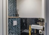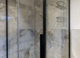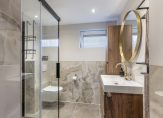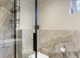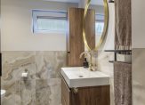De badkamer is voorzien van een inloopdouche met zowel en regen- als handdouche, een wastafelmeubel met spiegel, bergmeubel en tweede toilet. Tevens beschikt de ruimte over zowel mechanische ventilatie als een raampje voor natuurlijke ventilatie.