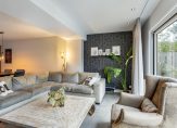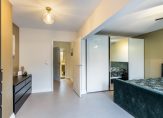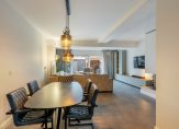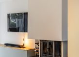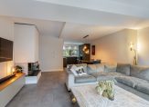 De lichte woonkamer beschikt door de grote raampartij over veel natuurlijk licht en is voorzien van een pvc vloer met vloerverwarming, een sfeervolle open haard en strakke wand- en plafondafwerking. Via een schuifpui is er toegang tot de achtertuin.