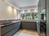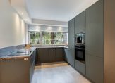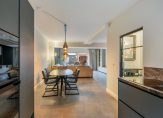 Aan de voorzijde van de woning bevindt zich de moderne keuken in een U opstelling. Deze strakke keuken met prachtig werkblad is voorzien van alle hedendaagse inbouwapparatuur zoals een inductie kookplaat met ingebouwde afzuiging, koel-/vriescombinatie, vaatwasser, quooker, combi-oven (Siemens) en een volautomatische koffiemachine (Siemens).