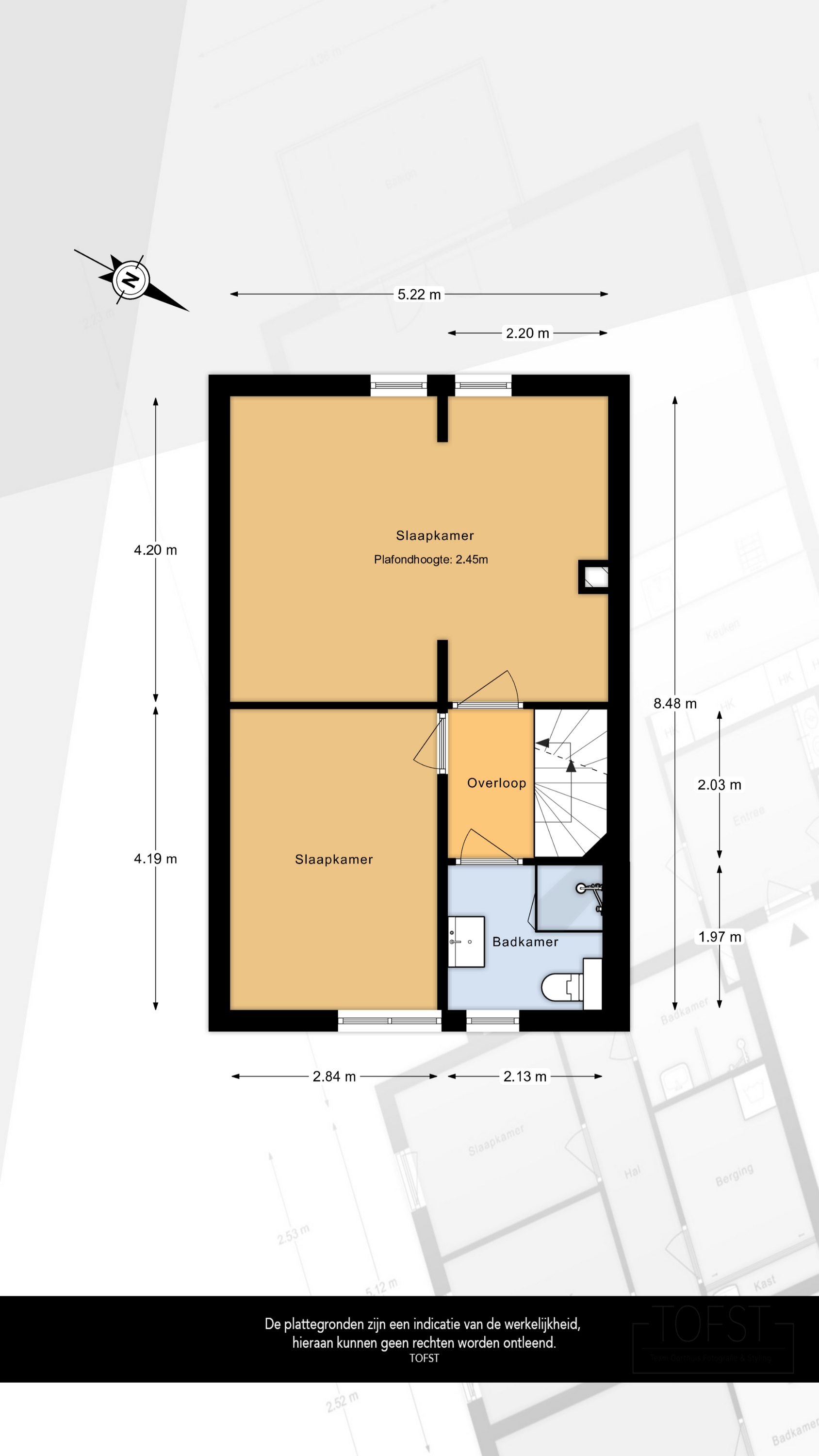 Op deze etage bevinden zich twee slaapkamers. De kamers zijn beide voorzien van een laminaatvloer en extra bergruimte middels ruimte achter de schotten en een vaste kast.
