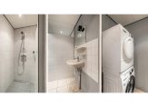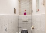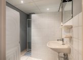 De keurige badkamer is vergroot, geheel betegeld en voorzien van een fijne inloopdouche,wastafel met plancet en spiegelkast, inbouwspots en de aansluitingen van zowel de wasmachine als de droger. De toiletruimte is separaat, geheel betegeld en voorzien van een hangend closet.