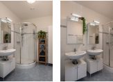 Keurige badkamer met douchecabine, dubbele wastafel met meubel en spiegels met verlichting, designradiator, gedeeltelijk betegeld en mechanische afzuiging.