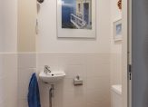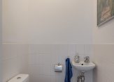 Separaat toilet met hand wasbakje, gedeeltelijk betegeld en mechanische afzuiging.