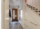 Entree onder luifel, hal met garderoberuimte, meterkast, trapkast, bergkasten en toilet met hand wasbakje, gedeeltelijk betegeld en mechanische afzuiging.