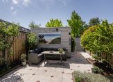Heerlijke achtertuin met groot terras op het zonnige zuidwesten voorzien van elektrische zonwering en verlichting, groene borders, houten erfafscheidingen met betonnen palen en een vrijstaande houten berging circa 6 m² met elektra.