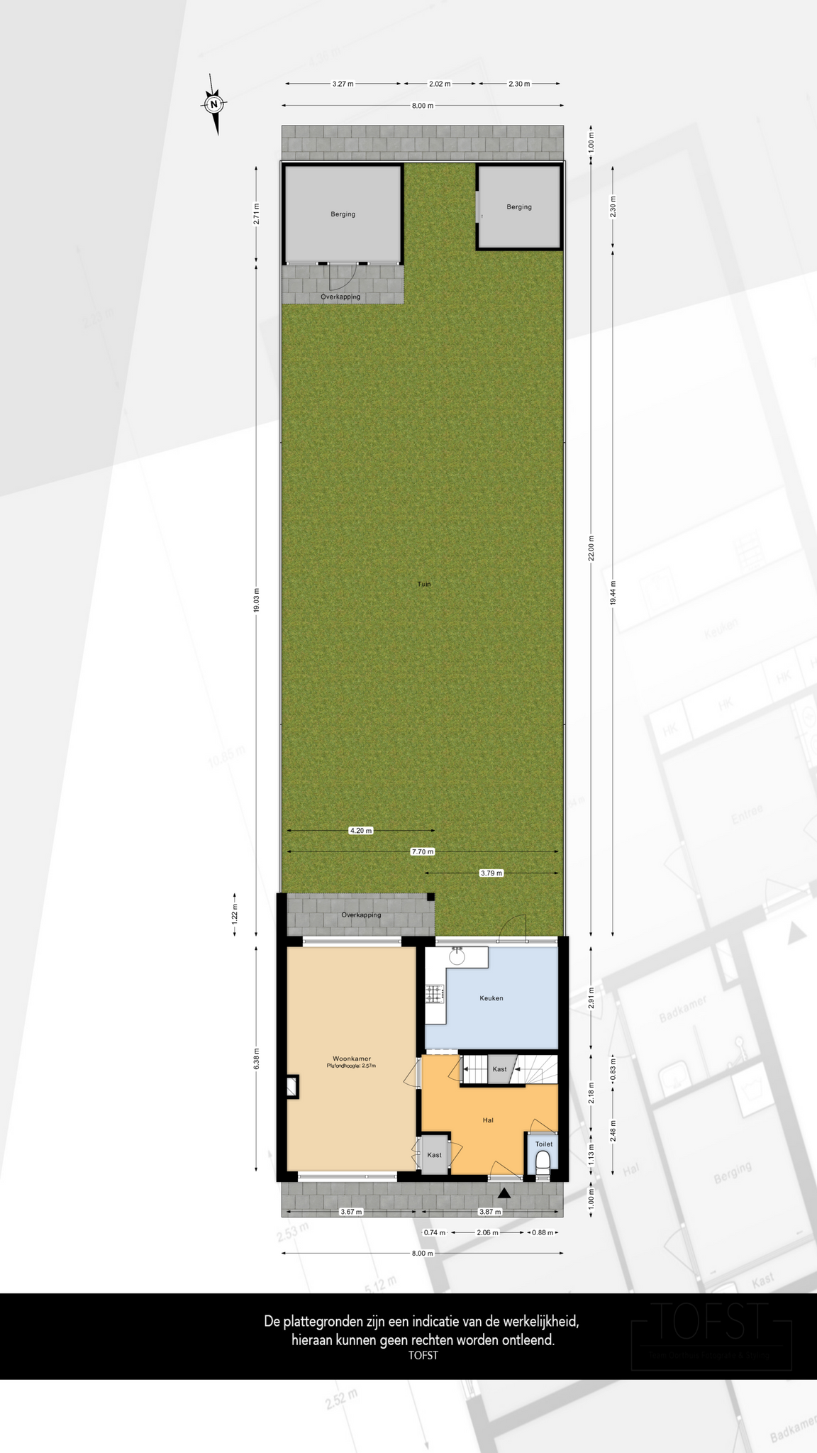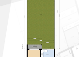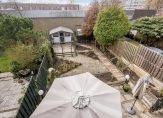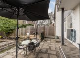– Royale en zonnige achtertuin van 22 meter diep, totaal 174 m² met berging en achterom;