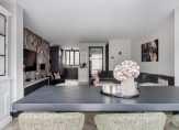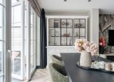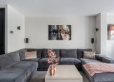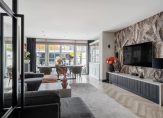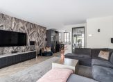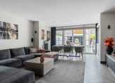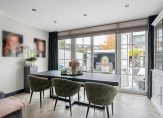 Middels de zwart stalen deur met glas kom je uit in de eetkamer en stapt door naar de tuingerichte woonkamer van circa 33 m² met pvc visgraat vloerafwerking voorzien van hoge plinten en vloerverwarming, strakke afwerking zoals in de gehele woning, inbouwplafond spots en dubbele openslaande deuren naar de achtertuin.