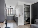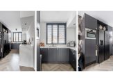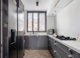 De moderne antraciete open keuken, circa 10 m², vindt u aan de voorzijde en is voorzien van alle hedendaagse inbouwapparatuur als een 5-pits gaskookplaat met inbouw afzuigunit, combi-oven, oven, koel-vriescombinatie, vaatwasser en spoelbak met kokend waterkraan merk Quooker.