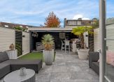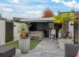 Fraai aangelegde circa 9.5 meter diepe onderhoudsarme achtertuin met terras op het zonnige westen voorzien van dakoverstek met inbouwspots, elektrische zonwering, strook kunstgras en houten erfafscheidingen met verlichting.