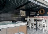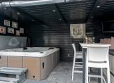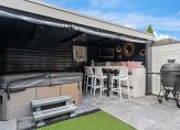 Achter in de tuin staat een fraaie afsluitbare overkapping van circa 13 m² met jacuzzi (ter overname), verlichting, elektra en voldoende ruimte voor een loungeplek en een achterom.