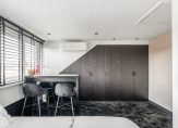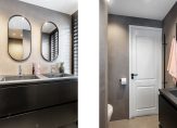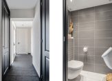 Modern toilet met hangend closet, urinoir, fraai betegeld in antraciet/witte kleurstelling tot het met inbouwspots verlaagde plafond en mechanische afzuiging.