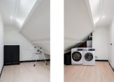 Was- stookruimte met opstelling wasmachine, wasdroger, cv-combiketel en een flinke bergruimte.