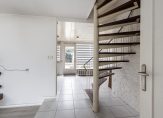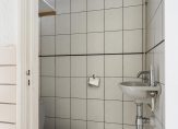 De ontvangsthal van de woning beschikt over garderoberuimte en een geheel betegelde toiletruimte met staand closet en fontein.
