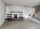 De z-vormige woonkamer is gelegen aan de voorzijde en beschikt over een zitkuil, dat zich kenmerkt voor het bouwjaar van de woning. De eetkamer grenst aan de keuken en is gelegen aan de achterzijde. Verder is deze ruimte voorzien van een sfeervolle haard.