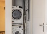 Er is een aparte vast kast aanwezig met daarin de opstelling van de wasmachine, droger en de elektrisch boiler.