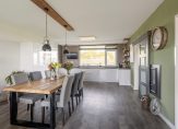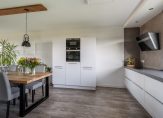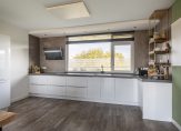 Aan de voorzijde bevindt zich de open keuken met een witte hoogglans opstelling en alle hedendaagse inbouwapparatuur waaronder een koel-/vriescombinatie, magnetron, oven, vaatwasser, inductie kookplaat en afzuigkap. Er is een close in boiler voor het warm water.