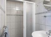 De geheel betegelde badkamer is voorzien van een douchehoek, wastafel en de aansluiting voor de wasmachine.