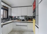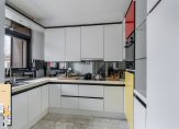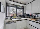 Keurige half open keuken aan de voorzijde, circa 7 m², in witte kleurstelling met keramische kookplaat voorzien van afzuigkap, oven, koelkast, vaatwasser en spoelbak.