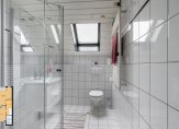 Keurige badkamer circa 5 m² voorzien van douchecabine, wastafelmeubel met spiegel, tweede hangend toilet, designradiator, dakraam en mechanische afzuiging.