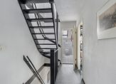 Entree woning, ruime ontvangsthal voorzien van trap naar de eerste verdieping, meterkast en keurig toilet met hangend closet, hand wasbakje en betegeld tot het plafond.