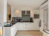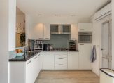 De moderne L-vormige keukenopstelling is van alle gemakken voorzien met een 5-pits gaskookplaat met afzuigkap, koelkast, combi-oven en vaatwasser.
