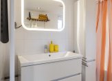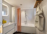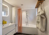 Vanuit de keuken komt u uit in de badkamer, welke geheel is betegeld en is voorzien van een ligbad met douche, wastafelmeubel met verlichtbare spiegel en inbouwspots.