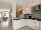 Vanuit de centrale hal komt u uit in de woonkamer met open keuken. De gehele begane grondvloer is voorzien van een moderne vloerafwerking met hoge witte plintafwerking, de wanden zijn strak afgewerkt en de kozijnen zijn uitgevoerd in kunststof met dubbel glas. Tevens is er een airconditioning geïnstalleerd die zowel kan koelen als verwarmen.