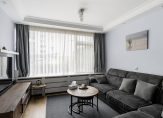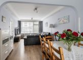 De lichte doorzonwoonkamer is afgewerkt met een strakke wand-en vloerafwerking, inbouwspots en de kozijnen zijn voorzien van dubbel glas.