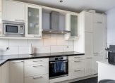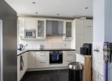 De L-vormige open keukenopstelling is aan de tuinzijde gelegen en beschikt over een vaatwasser, oven, inductie kookplaat met afzuigschouw, Amerikaanse koelkast en veel kastruimte.