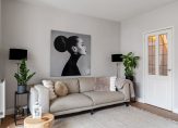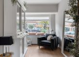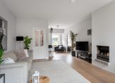 Via de modern betegelde voortuin met antraciete betegeling voorzien van zitplek en plantenbakken komt u binnen middels de fraaie voordeur in de ontvangsthal met de meterkast, garderoberuimte en geheel betegelde toiletruimte met hand wasbakje. De royale woonkamer van circa 32 m² heeft door de aanbouw een diepte van bijna 11 meter, met een sfeervolle houthaard en een karakteristieke erker aan de voorzijde. De gehele begane grond is mooi afgewerkt met eiken houten vloerdelen voorzien van hoge plinten en strak stucwerk afwerking.