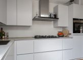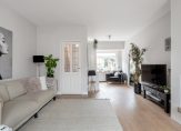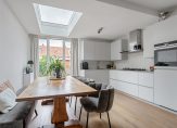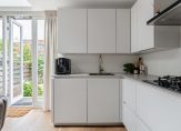 Aan de achterzijde bevindt zich de moderne en greeploze witte keuken uit 2021 van circa 7 m² welke is voorzien van gaskookplaat op glas met afzuigschouw, stoomoven, koelkast, vaatwasser en een spoelbak met een kokend waterkraan van het merk Quooker. Verder is de keuken heel modern afgewerkt met inbouwverlichting. Door de speelse indeling geeft de keuken een leuke inkijk naar de woonkamer en de uitbouw biedt voldoende ruimte voor het plaatsen van een ruime eettafel onder het daklicht.