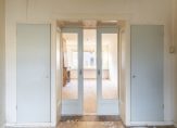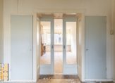Ruime woonkamer in sfeervolle kamer-en-suiteopstelling van circa 36 m², voorzien van dubbele schuifdeuren en vaste kasten tussen de voor- en achterkamer.