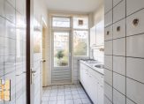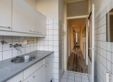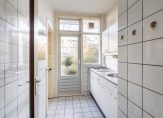 Aan de achterzijde bevindt zich de eenvoudige maar nette keuken van circa 4 m², uitgerust met een 4-pits gaskookplaat, spoelbak, opstelplaats voor de wasmachine en een deur naar de achtertuin.