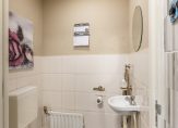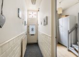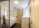 Via de keuken bereikt u de praktische bergruimte, welke deels is betegeld en tevens directe toegang biedt tot de deels betegelde toiletruimte voorzien van een staand closet en fontein. Vanuit deze bergruimte wordt weer de toegang verstrekt naar de eerste badkamer welke geheel is betegeld en is voorzien van een douchehoek, dubbel wastafelmeubel, designradiator en de aansluiting van de wasmachine.