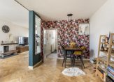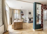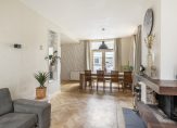 De riante woonkamer heeft een diepte van ruim 8.5 meter en door de grote hoeveelheid raampartijen komt er veel natuurlijk licht de woning binnen. De begane grond is voorzien van een sfeervolle visgraat parketvloer met zwarte bies en hoge plintafwerking, strakke wandafwerking, een gezellige open haard en het glas-in-lood maakt de woning helemaal compleet.