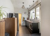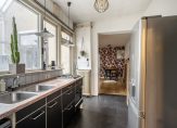 De keukenopstelling is aan de achterzijde van de woning gelegen en beschikt eveneens over veel natuurlijk lichtinval met de grote raampartijen die uitkijken over de tuin. De keuken is voorzien van 4-pits gaskookplaat, magnetron, losse koel-vriescombinatie en losse vaatwasser.