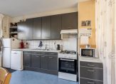De lichte woonkamer is aan de voorzijde van de woning gelegen en beschikt door de grote hoeveelheid raampartijen over veel natuurlijk lichtinval. De ruime keuken is aan de achterzijde van de woning gelegen en voorzien van een eenvoudig keukenblok met vaatwasser, koel-vriescombinatie en gasfornuis met oven.