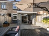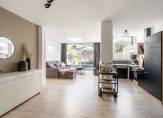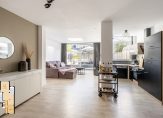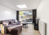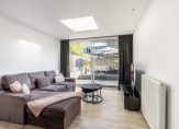 De uitgebouwde woonkamer is een hele fijne leefruimte voorzien van een moderne houtlook laminaatvloer met hoge plinten, strakke afwerking en een daklicht voor veel lichtinval. Middels de schuifpui komt u in de achtertuin.