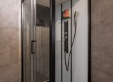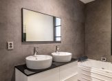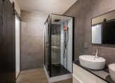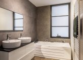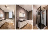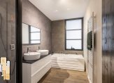 Loft deur voor toegang tot de moderne badkamer is circa 8 m² voorzien van een ligbad met whirlpool, douchecabine, dubbel wastafelmeubel met waskom en spiegel, design radiator en mechanische afzuiging.