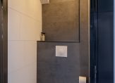 Modern toilet voorzien van hangend closet, betegeld in antraciet/witte kleurstelling tot het plafond.