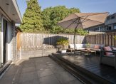 Moderne achtertuin van circa 40 m² groot met houten erfafscheidingen met betonnen palen en groot terras voorzien van elektra en verlichting. Middels de achterom komt u uit bij de berging.