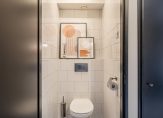 Moderne toiletruimte met mooie witte wandbetegeling, antraciet vloertegels en een zwevend toilet.