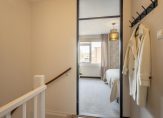 Overdekte entree met naast de voordeur de meterkast. De ontvangsthal biedt toegang tot de trap naar de eerste verdieping, de eerste slaapkamer en de badkamer.