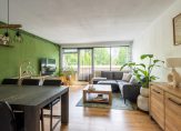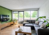 Middels de vaste trap met trapkast komt u uit op de derde woonlaag van het complex waar allereerst de lichte woonkamer is gelegen. Op de vloer ligt een moderne laminaatvloer, de wanden zijn strak afgewerkt en de kozijnen zijn van hard hout met dubbel glas. Middels de loopdeur wordt de toegang verstrekt tot het zonnige balkon, waar u geniet van veel rust en privacy.