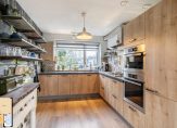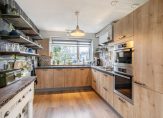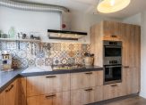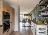 Aan de voorzijde bevindt zich de ruime en moderne open keuken met houtlook fronten en een antraciet werkblad. De keuken is uitgerust met alle hedendaagse inbouwapparatuur, waaronder een gaskookplaat met afzuigschouw, oven, magnetron, koel-/vriescombinatie, vaatwasser en spoelbak.