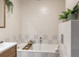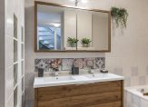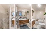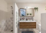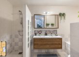 De badkamer van maar liefst 7 m² is compleet uitgerust met een ligbad, inloopdouche, tweede hangend toilet, wastafelmeubel met dubbele kraan, spiegelkast met verlichting, radiator en mechanische afzuiging.